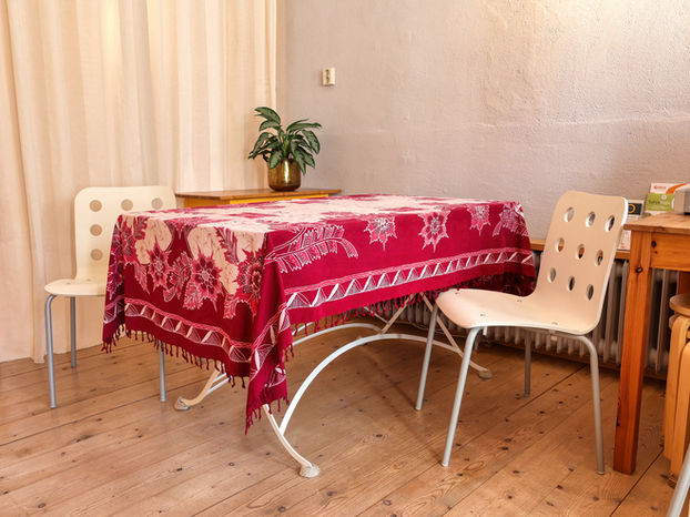 Bij binnenkomst sta je meteen in de kleedruimte. De schuifdeur geeft toegang tot het keukentje met zitgedeelte, geschikt voor individuele coaching of groepsgesprekken. Rondom de tafel staan krukjes, maar er zijn ook stoelen beschikbaar.